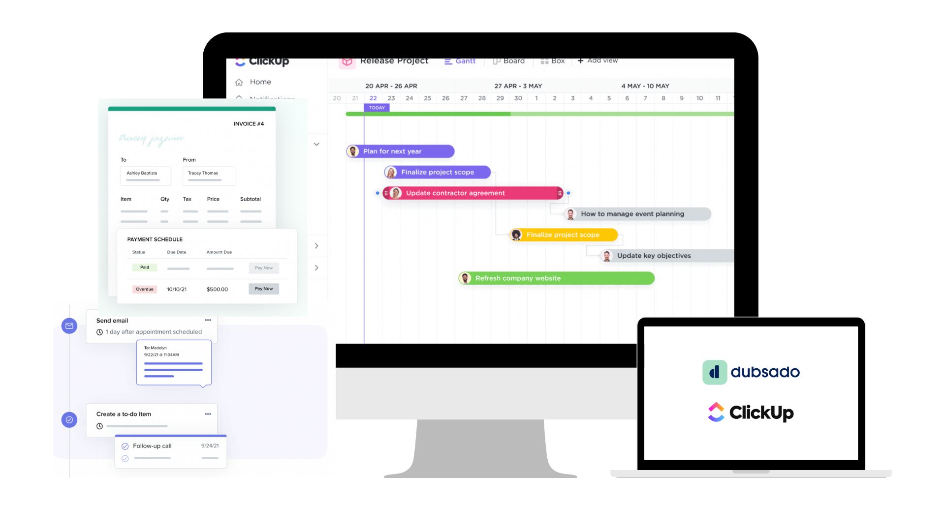 This package provides you with a custom client journey workflow using Dubsado and ClickUp to help you streamline your lead capturing, onboarding, service delivery, and off-boarding processes.